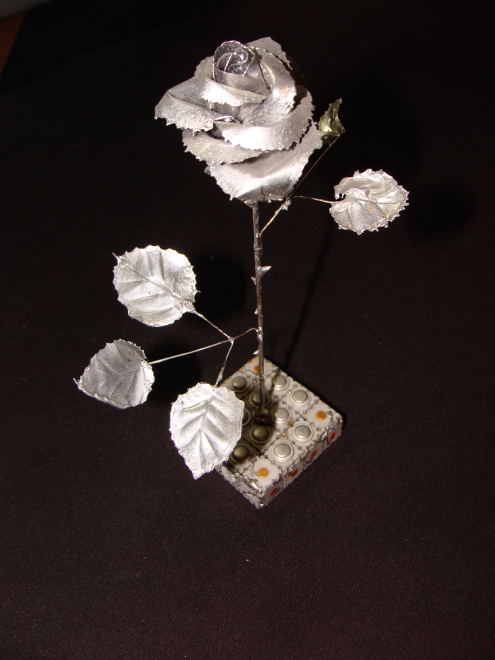 | Роза из олова. Подставка из старых сборок. Применялись: транзисторы, диоды, резисторы. | |