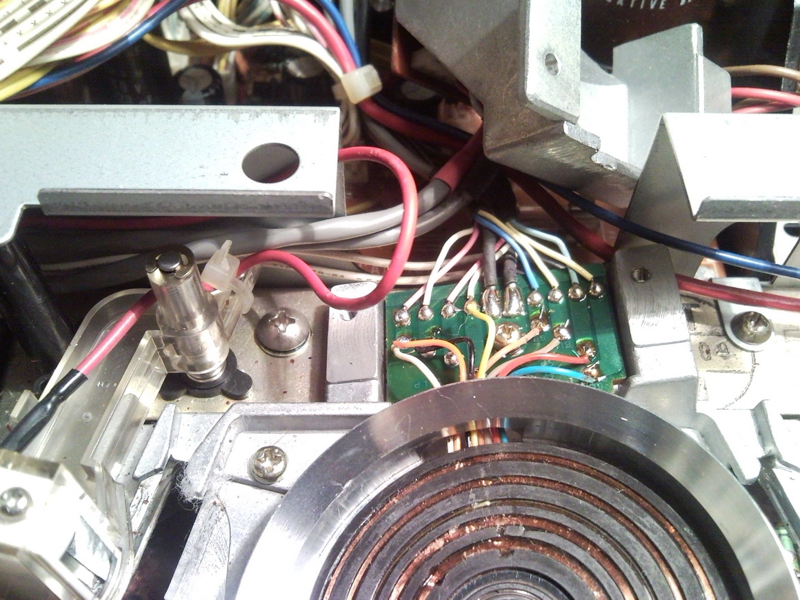 По сенсору получилось очень интересно . Не работал сенсор определяющий обрыв ленты в кассете и выполняющий еще несколько функций . Оптопара стоит близко к плоскости ленты , по краям кассеты и перекрывается лентой в режиме Play . В режиме перемотки лента отводится от БВГ . Причина оказалась в том , что последняя направляющая стойка , рядом с прижимным роликом , перекрывала световой поток буквально на три-четыре десятых миллиметра . Просто стальной кулачек отвода направляющей (на фото он правее ролика , внизу) , чуть потер алюминиевый упорный рычаг , которым она отодвигалась .