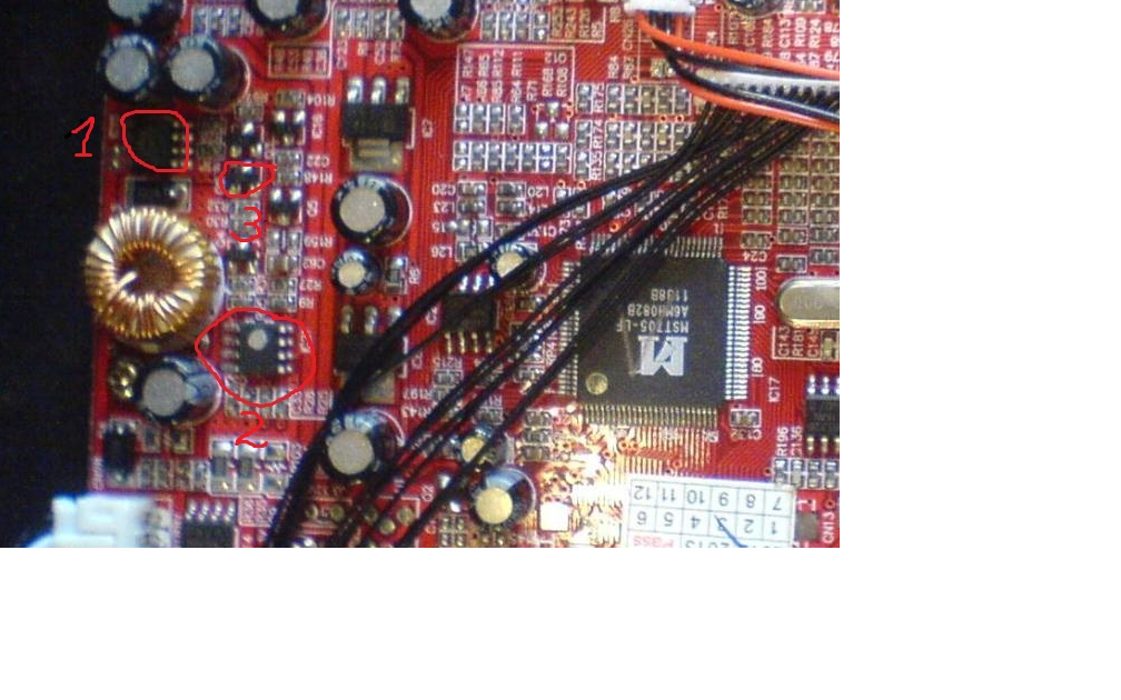 Доброго всем времени суток! Попал в ремонт XYUNDAI PDP1988SUATV шасси MST705+MT1389J V2,подключили +24в выгорело 3 элемента прочитать что было не возможно,фото платы нашел в нете оно один в один с моим.Элементы обвел и пронумеровал красным цветом.