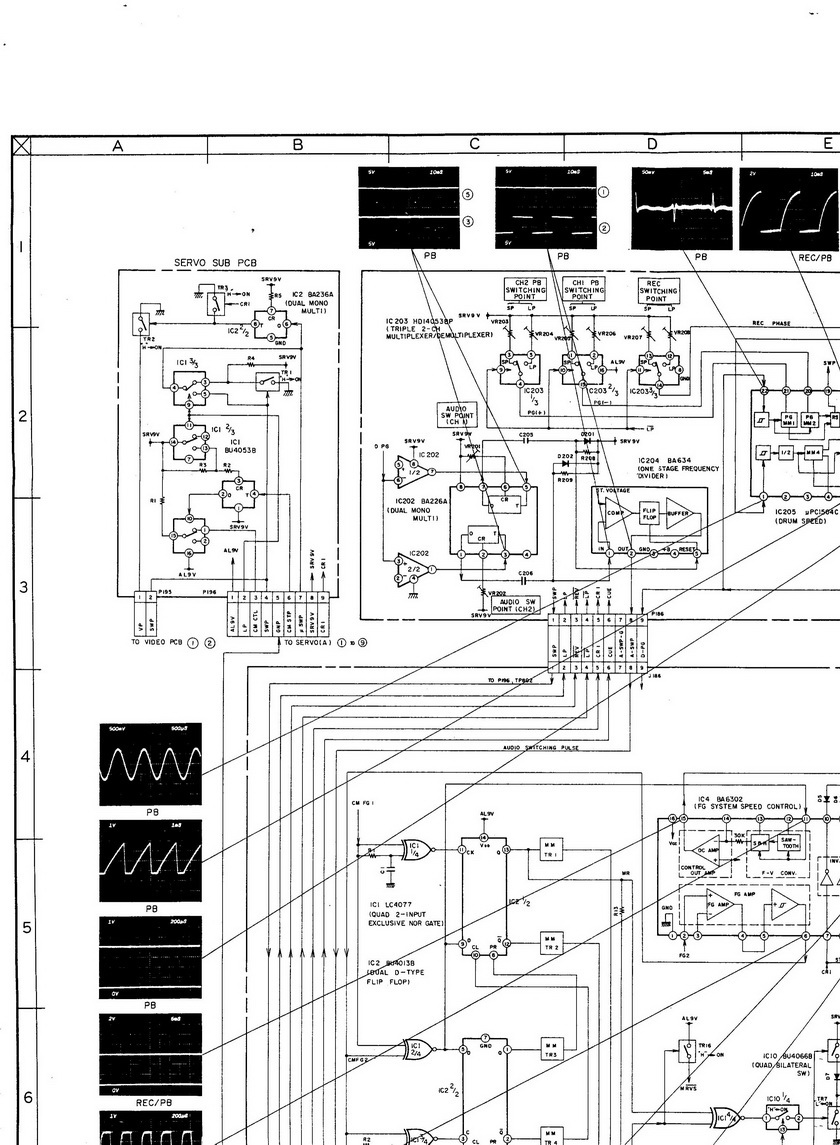 схемы нет . Неисправность возникла в ходе восстановления работоспособности БП . Были небольшие пульсации на выходе питания 5 В и я подпаял доп емкость 500мкФ прямо на разъем P136 (pin4) платы управления серво V1030A5380. Возможно емкость была не разряжена . В результате видик не вышел из режима standby . При включении где-то через час аппарат включился , но левая бобышка непрерывно вращалась , режимы работы переключались , индикация работала . При повторном включении индикация перестала работать , но на драйвере Ва6229 двигателя подмотки (у аппарата стоит отдельный подмоточный движок с айдлером) было управляющее напряжение . После того , как я выставил программную шестерню по меткам , вращение прекратилось . Напряжение на БП соответствует даташиту , Данные по шине D на МВ88305 pin 8-11 , 7 поступают . При включении вилки в сеть индикация на передней панели (светодиоды) засвечиваются в штатном режиме и аппарат переходит в standby т.е. как и должно быть но не включается . Видимо процессор в ходе включения где-то видит неисправность . В настоящий момент аппарат включается только после приема кассеты и после загрузки работает перемотка вправо и частично режим play (БВГне вращается видик становится в режим standbay) . Иногда наоборот , при включении вилки в сеть , сразу включается и не выключается . reset , при подключении к сети , проходит по соответствующим шинам . Не пойму , где искать . Может быть у кого-то есть схема этого или похожего аппарата с этими процессорами или опыт работы с ними . Помогите , пожалуйста .)