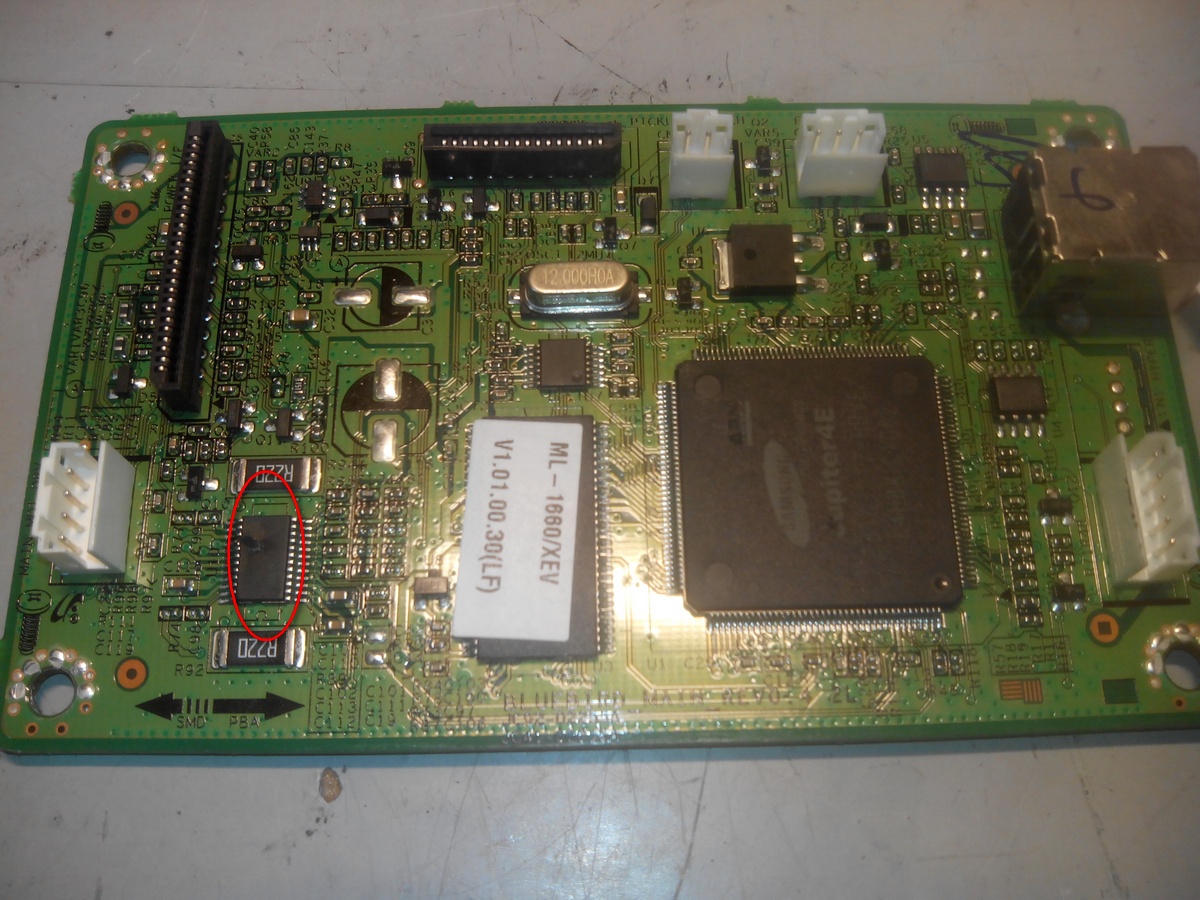 Samsung ML-1660 при включении пытает пошевелить двигателем и выключается. При осмотре на майн плате JC92-02255A (BLUEBIRD_MAIN_REV0.4 2L) выявлена сгоревшая микросхема. Отвечает как раз за управление двигателем.