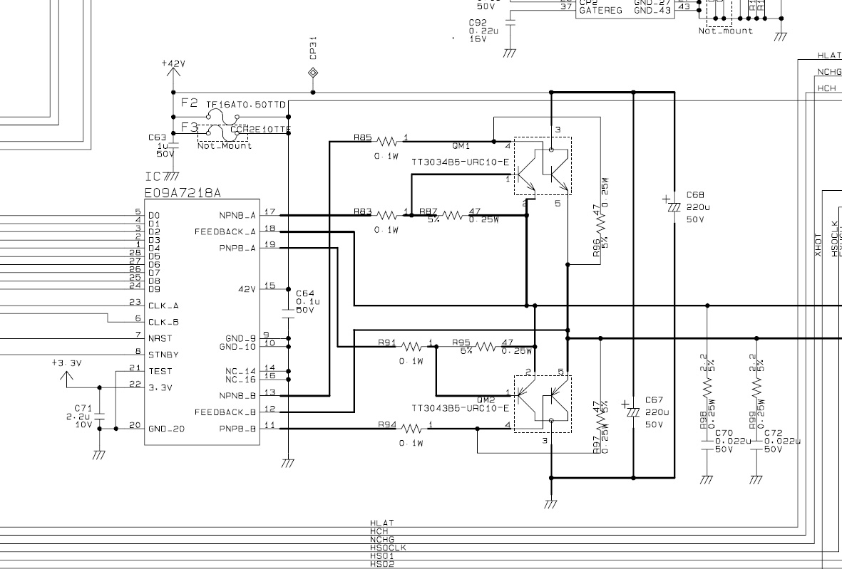| Схему нашел, по поводу ремонтов принтеров Т50, Р50 и т.д. если залита ПГ то в любом случаи летят два транзистора TT3034 и TT3043 (предохранитель не всегда спасает) летит и драйвер ПГ Е09А7218А (принтер может вообще не включаться, может быть слышен свист БП. Если это слышно значит 100% выгорел драйвер) при рабочих ПГ и CSIC и присоединенных ПГ и CSIC сопротивление предохранителя F2 на массу должно быть >300-<400 Ом ,а сопротивления на 47 ОМ (база-эмитер) должны показывать (при впаянных и рабочих транзисторах) 34-35 Ом. Если показывают 47 Ом, значит подпаленный один из транзисторов. |