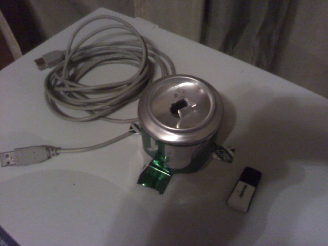 | Цитата: | | Под руки попалась банка из-под пива и вот результат. С USB удлинителем 3 метра появилось ещё 3 сети, мощь сигнала увеличилась вдвое. |