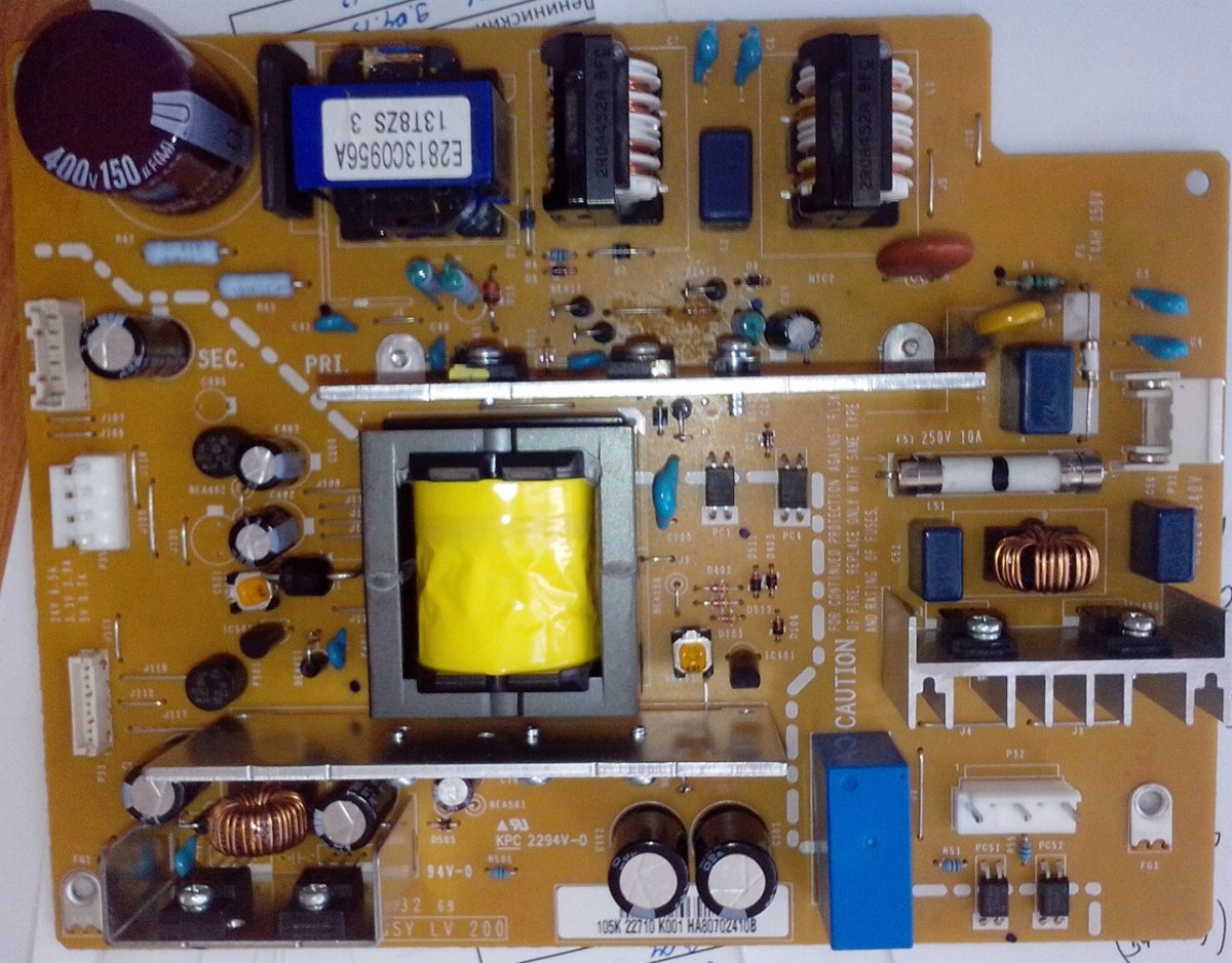 В ходе детального осмотра выяснилось, что пострадала плата питания, на ней выбило предохранитель, варистор. Сгоревшие детали замел, на плата не завелась.