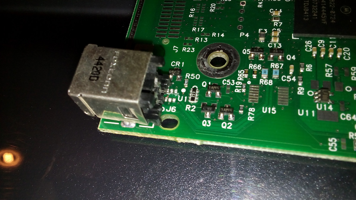 Видимо сильно пихали штекер в USB, в итоге выдавили разъём и им снесли какую то микросхему 6 ног, на плате подписано U1. Плата форматтера q2465-60001.