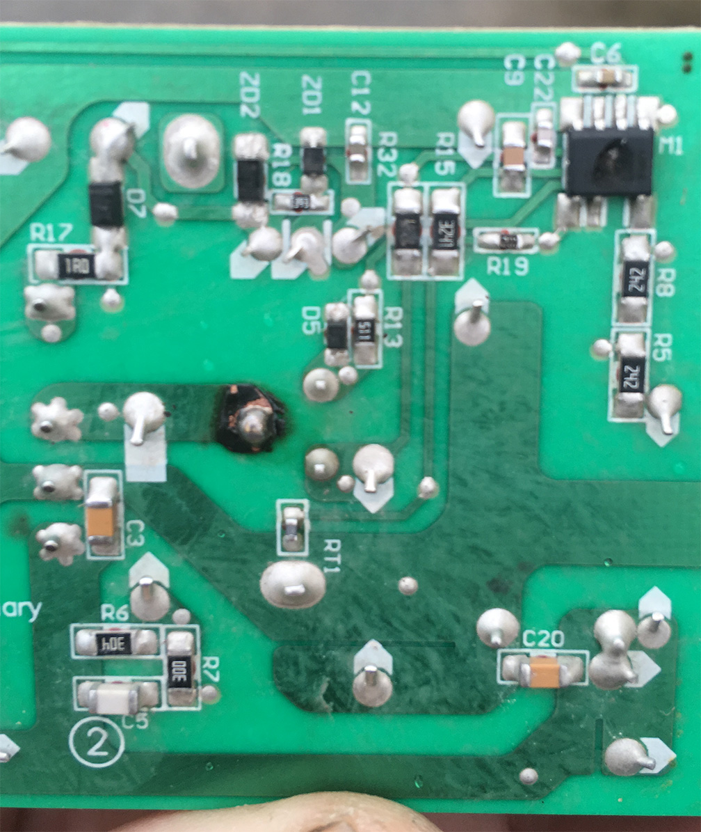 Отгорел "ноль" и упал на "фазу". В итоге погорела техника, включенная в сеть. Сгорел, в том числе, и БП от принтера (применяется также в G1410 / G1411 / G2410 / G2415 / G3410 / G3411 / G3415 / G4410). ШИМ выстрелил (остатков не нашел), сгорел мосфет и часть резисторов. Интересует сам ШИМ М1 (маркировка) и резисторы R19 и R32.