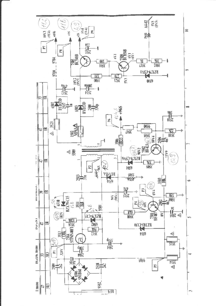 Если предположения верны то напряжение в Р4 93В вместо 60В можна обяснить то что транзистор 7501 недооткривается ы следовательно падение напряжения на 3508 недостаточное для обеспечение его на колекторе 7501 на уровне 60В..