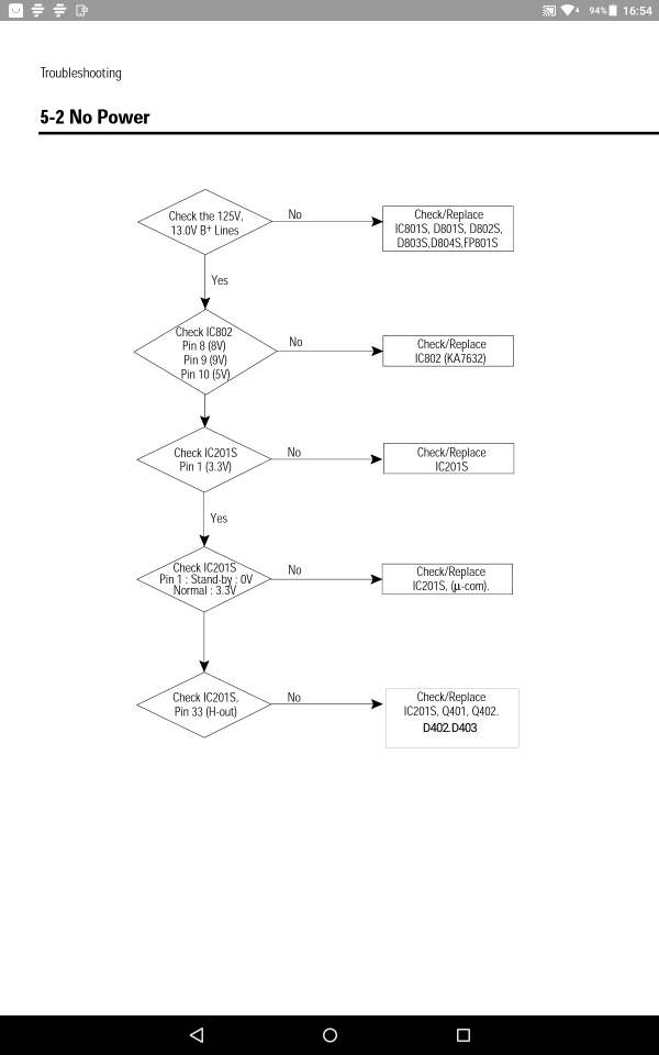 Если не лень, посмотрите алгоритм поиска, он из мануала. В прикрепленных файлах.Там 5 вольт быть не должно никогда. В норме ON 3.3v, OFF 0v. У меня ON при полном отсутсвии признаков работы 5в. Несколько минут стоит, срабатывает автовыключение, на пин 1 устанавливается ноль, на выключенном так и должно быть. Пульта нет, но кнопками переключения канало его можно "включить", все включение выражается только в том, что на пин 1 снова появляется 5в. Здесь я и зарылся. Из обвеса стабилитроны и диоды не выпаивая прозвонил, резисторы так же, то есть кое как, ничего вопиюще пробитого и оборванного не увидел и написал сюда, может, у кого такое было. Приговорить процессор в моём случае = приговорить телевизор. Дорого и много работы.