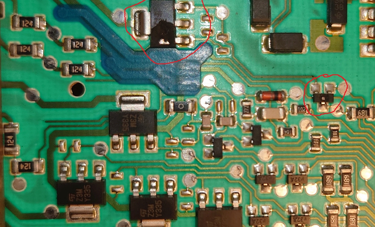 Осмотр платы показал, что взорвались симистор Z3M Y335, транзистор p32 3n