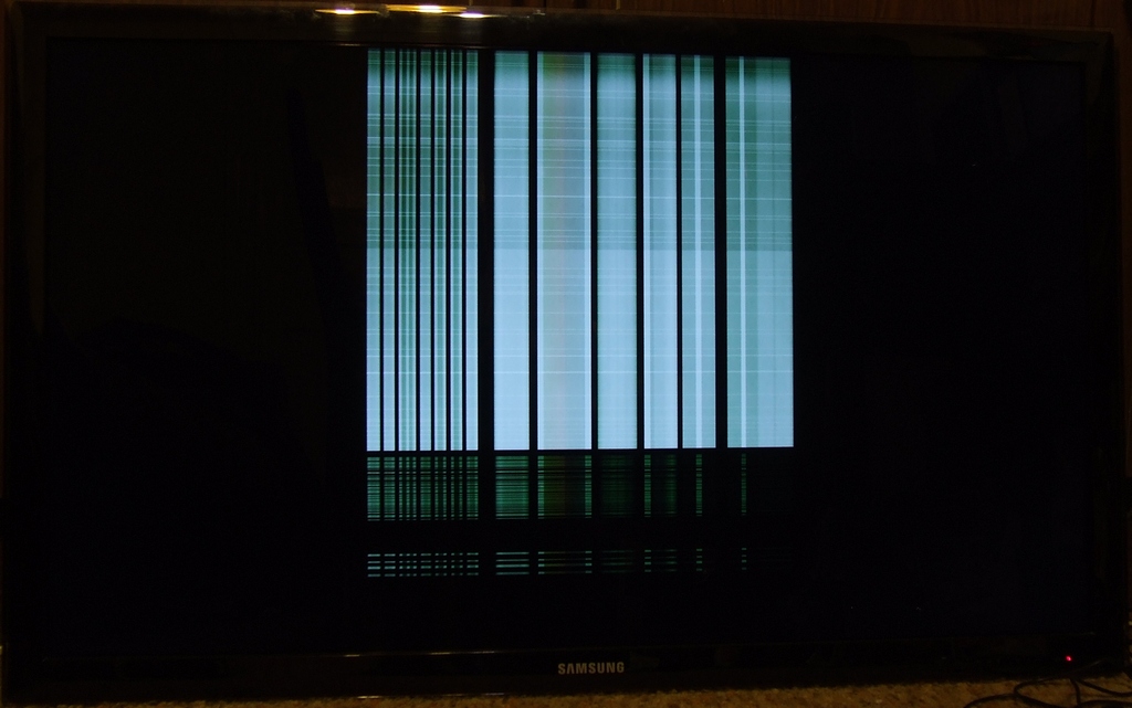 При включении на экране полосы (на фото). Изредка может включиться и нормально показывать. Думал шлейф к матрице отходит. Разобрал, вытащил/вставил все шлейфы - без изменений. А вот если во время работы передернуть шлейф с основной платы на плату управления матрицей, то изображение нормализуется и он стабильно работает до первого выключения (и работает долго, хоть пол-дня). Стоит только выключить и сразу включить - опять полосы. Как только передёрну шлейф - опять всё в порядке до выключения. Если телек не прогрелся, то вытащить/вставить этот шлейф помогает не всегда.