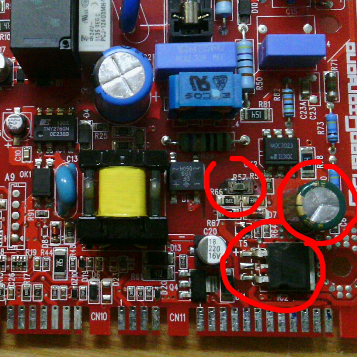 Подскажите, котел моргает зелёным, четыре раза и загорается красным.Плата издает звук в районе стабилизатора, не знаю должно быть так или нет.Отсоединил все датчики, без изменений.Очень сильно греются детали R57,C19,IС2.Помочь не кому, специалисты газовых служб разводят руками, говорят нужно менять плату