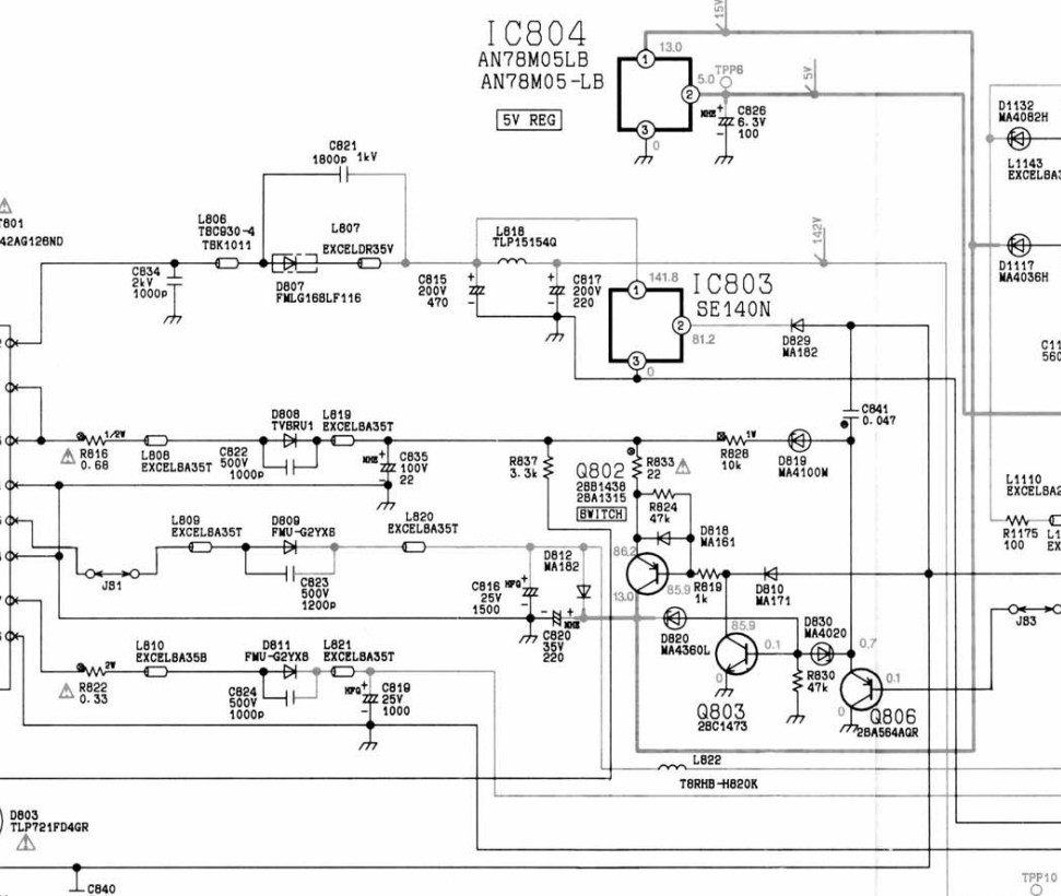 Всё сделал как вы сказали. Включил, нет запуска, начал проверять строку, на коллекторе транзистора-0. Проблема оказалась банальной, а именно , был оборван дроссель в цепи 135 в. , он зараза стоял под мощным наискосок строчным диодом, если не вооружаться взглядом, то видно было только ножки, я и принял его за перемычку. Восстановил обрыв, включаю, мп3 в защиту. Проверяю , пробитый диод D523 заменил на BY328, тв запустился, но осталась ещё одна проблема коррекция растра(подушка), пробежался ESR-ом заменил С528 и пробитый Q461. Всё восстановил, коррекция в норме. Получается я вешал лампу всё время в воздух, и выходит что блок питания без нагрузки вообще отказывался заводиться. Впредь буду ещё внимательнее.