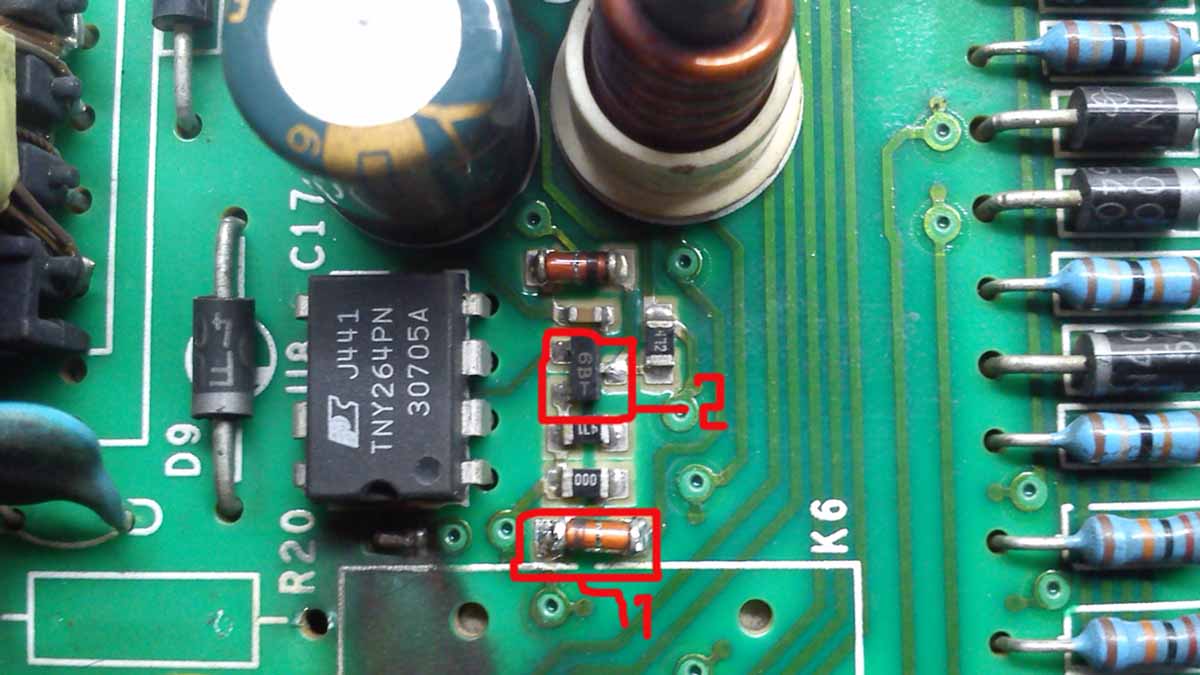 Нужна опознать 2- детали( 1- стабилитрон, 2- транзюк), былобы здорово если у кого есть схемка.