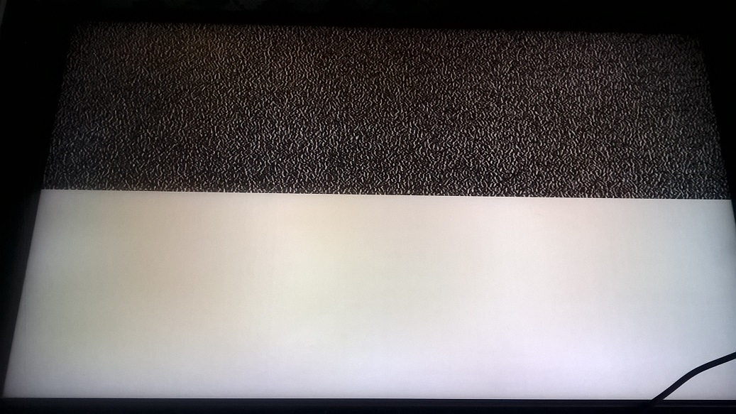 Дефект проявляется по разному. В основном сначала белый экран и через 10-20 секунд начинает работать верхняя четверть ( иногда половина ) экрана, редко включается нормально. От VGA дефекта нет но на темном фоне есть тонкие красные вертикальные линии, также при переключении с VGA на ТВ дефект пропадает. Звук присутствует. На белом фоне видно засвеченные белые пятна от воды?