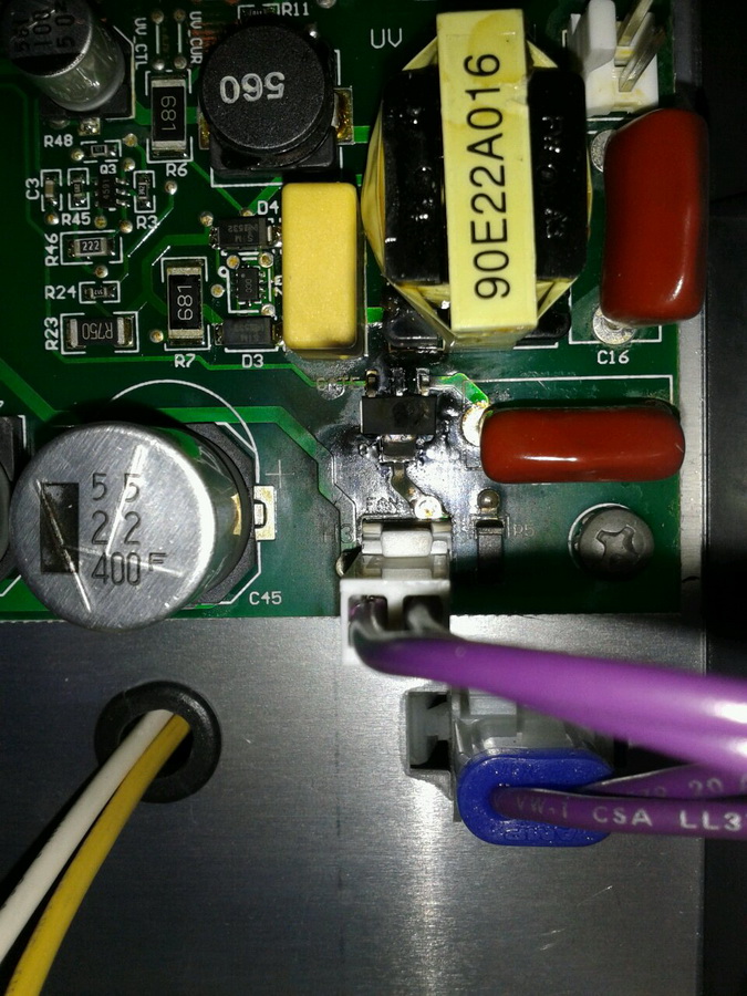 | Согласен, но причина точно не установлена. Аппарат стоял в баре, работал скорее всего круглосуточно, внутри было много пыли. Когда сгорел - никто не видел. Напряжение там частенько вырубается, у них даже свой аварийный генератор есть. Микрухи сгорели конечно, оптрон ic8 снизу разорвало, а ic9 - опрный стабилизатор - надо тоже менять. Вообще схема включения классическая для VIPer53, я всё ещё раз проверю и ещё вторичные цепи посмотрю, может коротнуло там, пыли то много было. |