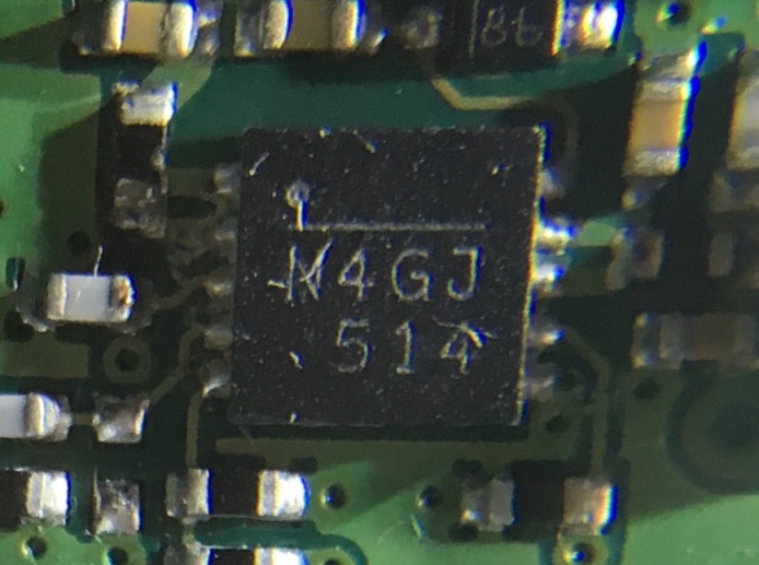 Всем Привет! Помогите опознать микросхему. Эхолот Garmin Strike 4 после включения через минуту выключается. Сильно нагревается микросхема на входе питания N4GJ 514 по пять ножек с двух сторон.