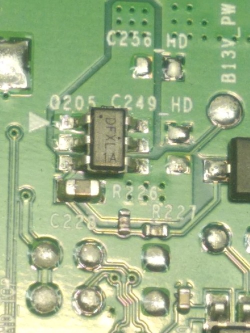 Здравствуйте. Помогите опознать деталь. Стоит возле разъема юсб наушников. Подали большее питание, чем нужно. Есть прогар по центру, среднюю букву не опознать. Корпус по размеру 2,0х2,0х0,75мм 6 выводов (dfn2020-6, sot1118,