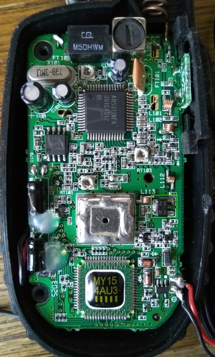 Добрый день! Помогите определить, что за SMD установлен (обведен зеленым на фотографии). Это мини-рация.