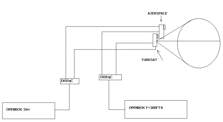 Стоят у меня две антенны. Одна на Hotbird 13, вторая на Turksat 42. На обеих антеннах по конвертеру с двумя выходами. Ну, соответственно, соединение идёт по дисеку, как положено. Один телевизор в одной комнате, второй - в другой комнате.
