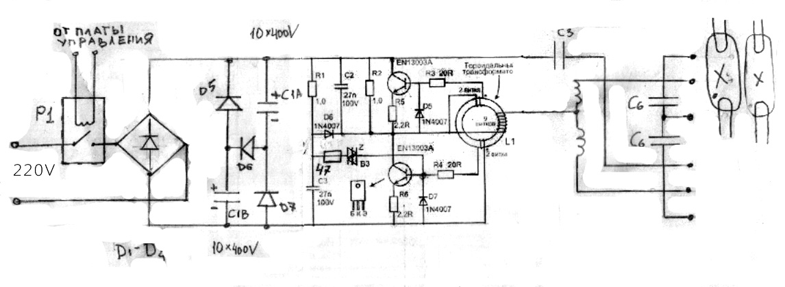 ГЕНАФ схема и принцип работы более-менее понятен,спасибо. Вопрос возник о применение на входе двух конденсаторов и диодов Д5,Д6,Д7. Что это , больше нигде это не попадалось. И еще как подключить две лампы к плате . До меня уже все было отключено .Есть похожие , но там два выходных конденсатора стоят раздельно , а здесь на схеме последовательно.