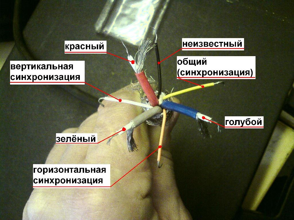 У монитора SUPERCOM отрезан 15-ти пиновый разъём кабеля VGA. С основными проводами – разобрался: красный – 1, зелёный – 2, голубой – 3. 6;7;8 – общие этих цветов соответственно, эти провода идут к разъёму на плату кинескопа (она садится на цоколь кинескопа). 5 – общий экран. Далее три провода идут на разъём платы синхронизации: оранжевый обозначен на плате буквой «Н» (horizontal) – припаял на 13, белый – «V» (vertical) на 14, жёлтый – «G» (ground) через схему звонится накоротко c общим экраном, припаял на 10. К какому контакту разъёма VGA паять чёрный провод и какова его функция, если он идёт к разъёму платы кинескопа вместе с цветовыми сигналами, далее – транзитом через другой разъём на плату синхронизации (определил прибором) и на разъёме платы синхронизации обозначен «ST»? Чёрный провод с общим экраном – не звонится.