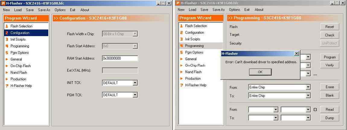 В H-JTAG нужно указывать начальный адрес загрузки для драйвера NAND. И понятное дело, это должен быть адрес 0x30000000, т. е. в SDRAM. Но у меня при указании такого адреса выдает ошибку как на картинке.