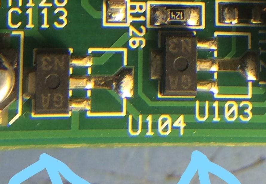 Не проходит дальше входной части напряжение "кроны"(9В),упирается в две одинаковые детали в корпусе SOT89 .Позиционное обозначение U103 , U104.