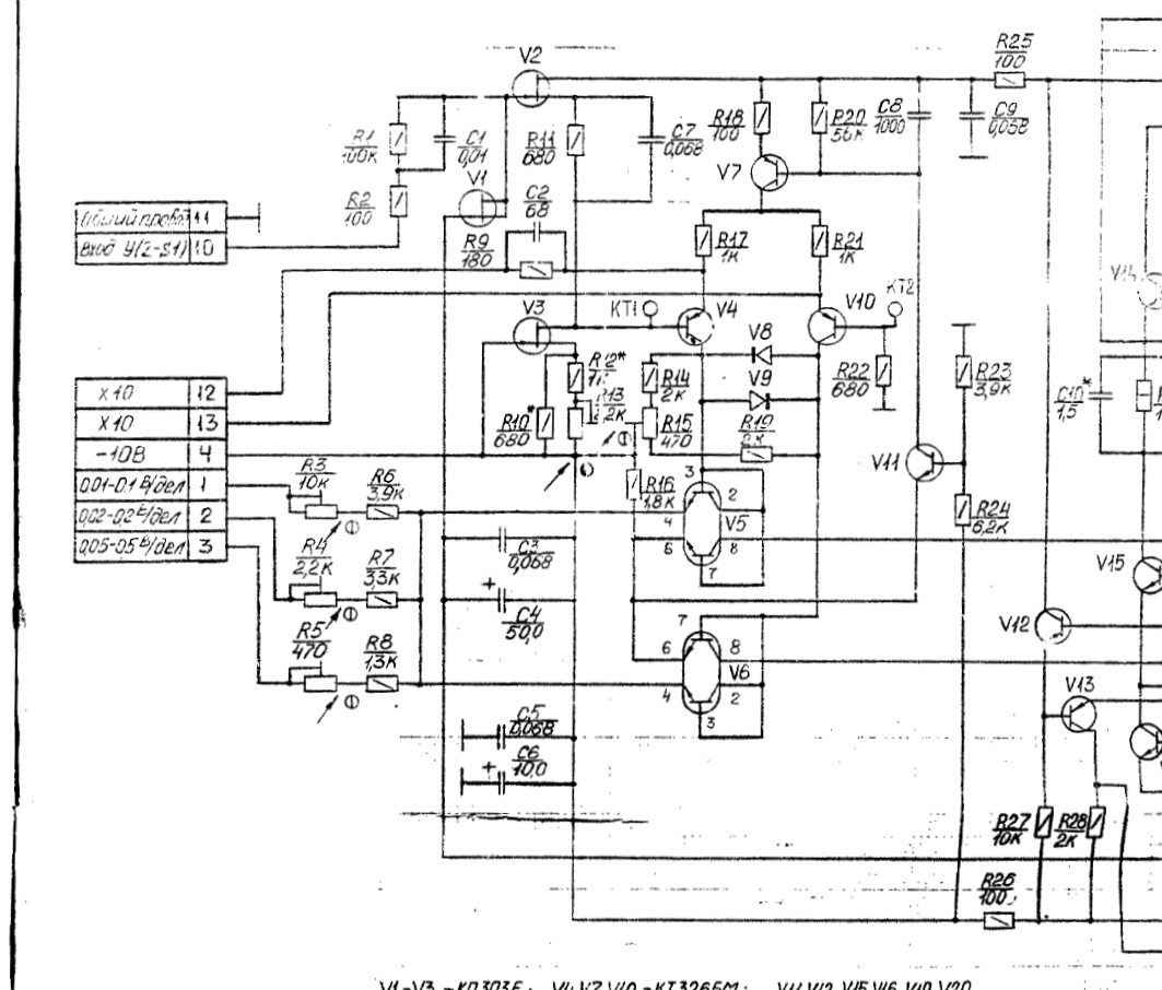 Транзисторные сборки,сначала переставил,потом поминял,изменений нет.Входные полевики целые,там если поставить плохой то луч убегает вверх на всех положениях переключателя 2S.