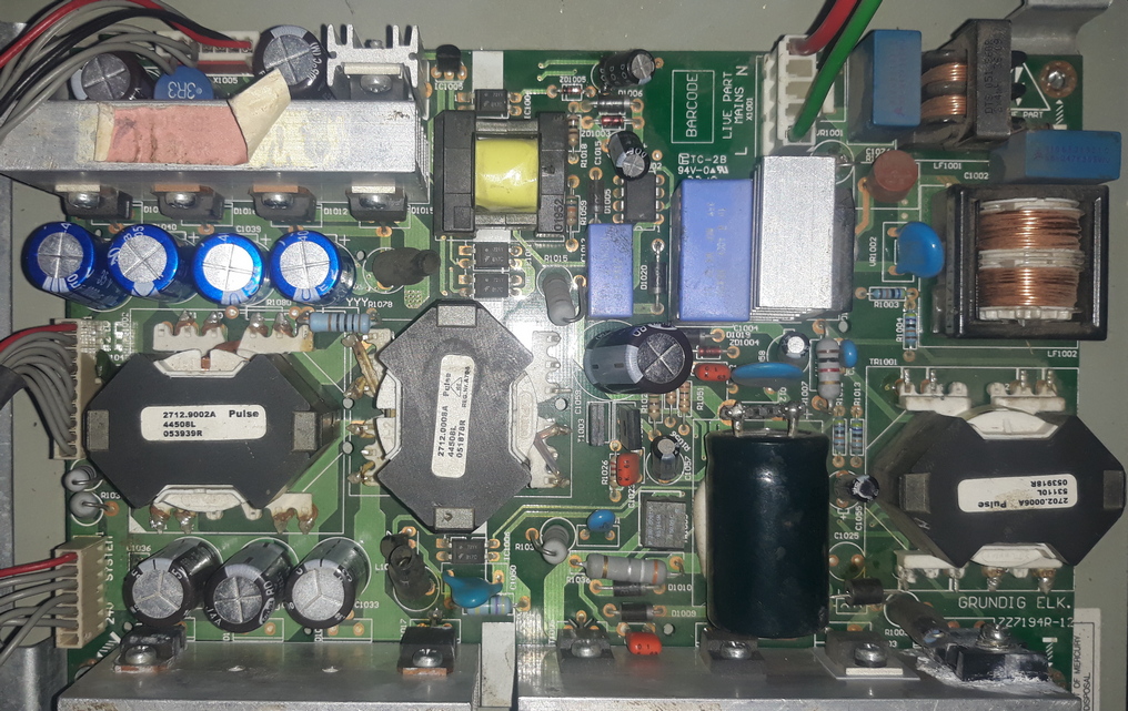 Пришел от других мастеров (владелец жаловался - долго включался). Сослались на неработоспособность и отсутствие в продаже MC3262D (IC1001) как нерабочей, также отсутствовал T1001. Пока разбирался с транзистором, впаял новую MC3262D. Схемы именно этого PSU не нашел, в 194R-11 стоит STW20NK50Z, его и впаял. Включился, PSU (телевизор) заработал. Изображение - несколько одинаковых квадратов меню, вроде бы на немецком. После повторного включения пропала подсветка. Потом включилась, но на экране циклично переключались цвета RGB.