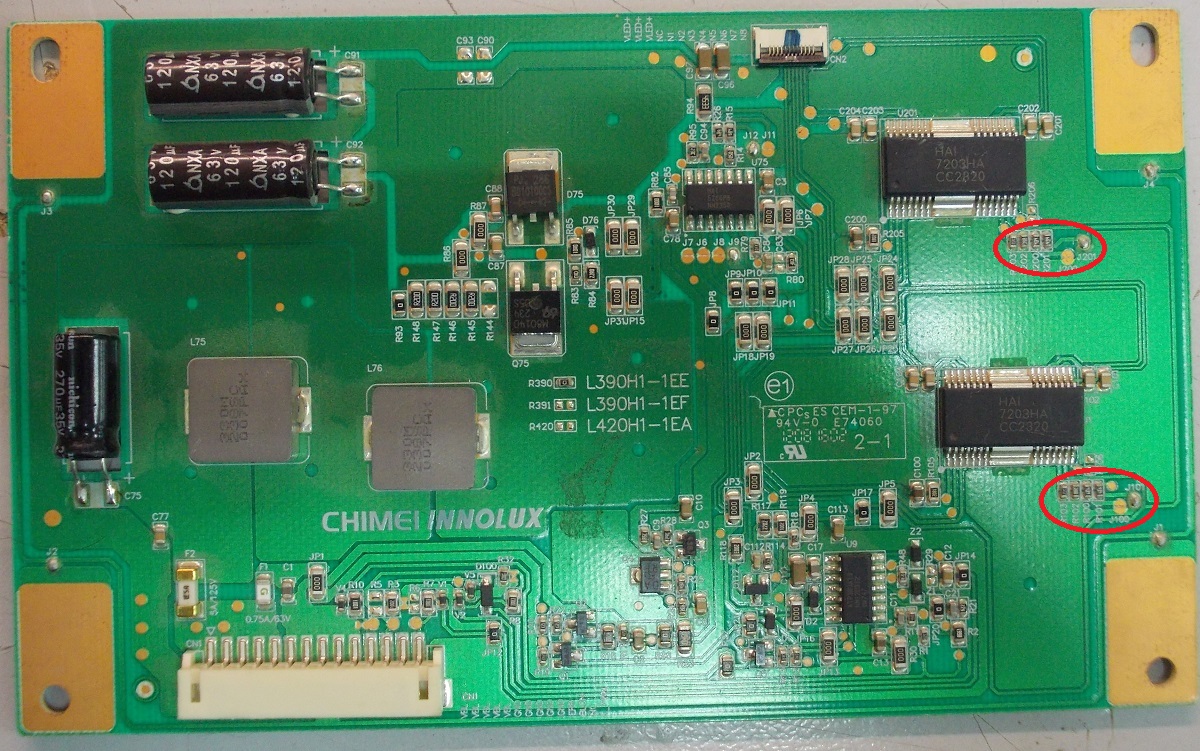 Читаю тему и смешно самому)). опыта набрался, ТВ теперь ремончу пачками (почти без возвратов). по лед драйверу - не нашёл ДШ микросхемки в этом аппарате, потому делюсь инфой. каждая из 7203 контролирует по 4 канала. токовые резисторы обвёл овалом. китайцы предусмотрели джамперы в виде контактных площадок (справа), удобно очень). до 15 кОм увеличил, ток стал около 120мА на канал. Нагрев стал ощутимо меньше.
