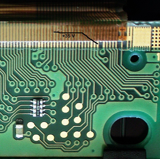 В общем весь вечер и пол ночи пялился в мелкоскоп. Самое горячее место примерно совпадает с точкой перехода шины +35 со шлейфа на стекло. Переход осуществлен, если я правильно понял, путем припаивания или приклеивания проводников шлейфа к металлизированным медным площадкам стекла. Так вот между площадкой шины +35 и соседней (земля) просматриваются следы металлизации. Вполне возможно, что именно они и проводят. Больше ничего не обнаружил. И что с этим делать? Дырку в стекле?