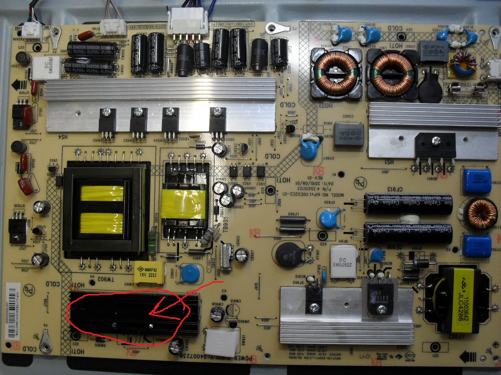 У меня такаяже плата питания. Аналогичные симтомы были из-за сгоревшей микросхемы, указанной на рисунке под черным радиатором. Дежурка была а при включении скачок на 0 и снова вдежурку. Не могли бы указать что написано на микросхеме, а то моя выгорела полнустью, осталась одна большая дырка на весь корпус. Схем к сожалению в сети пока не нашёл.