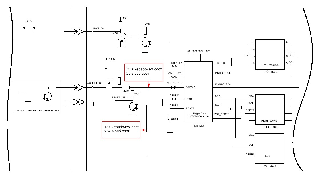 ТВ при подаче 220В засвечивает индикатор желтым цветом, в раб. режим не переходит, не управляется. В БП отдельно схема дежурного режима и рабочего. Если перед подачей сетевого напряжения поставить перемычку в цепи включения рабочего режима, то после включения в сеть (одновременно запущены обе схемы) через 2 мин 6 сек светодиод моргает красный-зеленый 6 раз и ТВ включается. Работает без замечаний, выключается в деж. режим и обратно. Если хотя бы кратковременно выключить питание полностью, опять не запускается. После сброса процессора управления FLI8532 ТВ не запускается независимо от наличия перемычки. Если принудительно включить рабочий режим блока питания уже после подачи сетевого напряжения, ТВ тоже не включится.