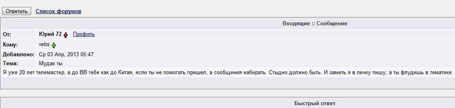 Юрий 72, не хрен вличку писать и хвастаться сколько лет ты телемастер. Я за тебя рад, что за 20 лет, так ни хрена и не можешь разобраться , где клиент , а где мастер. Любитель помогать клиентам на форумах? Судя по твоему высказыванию, в модераторы тебя поставить и все. Будешь, потом гонять, таких, как я. В отличии от тебя с мастерами не лаюсь ( различать нужно, где мастер, а где клиент), а клиентам написать и указать их место - это святое!