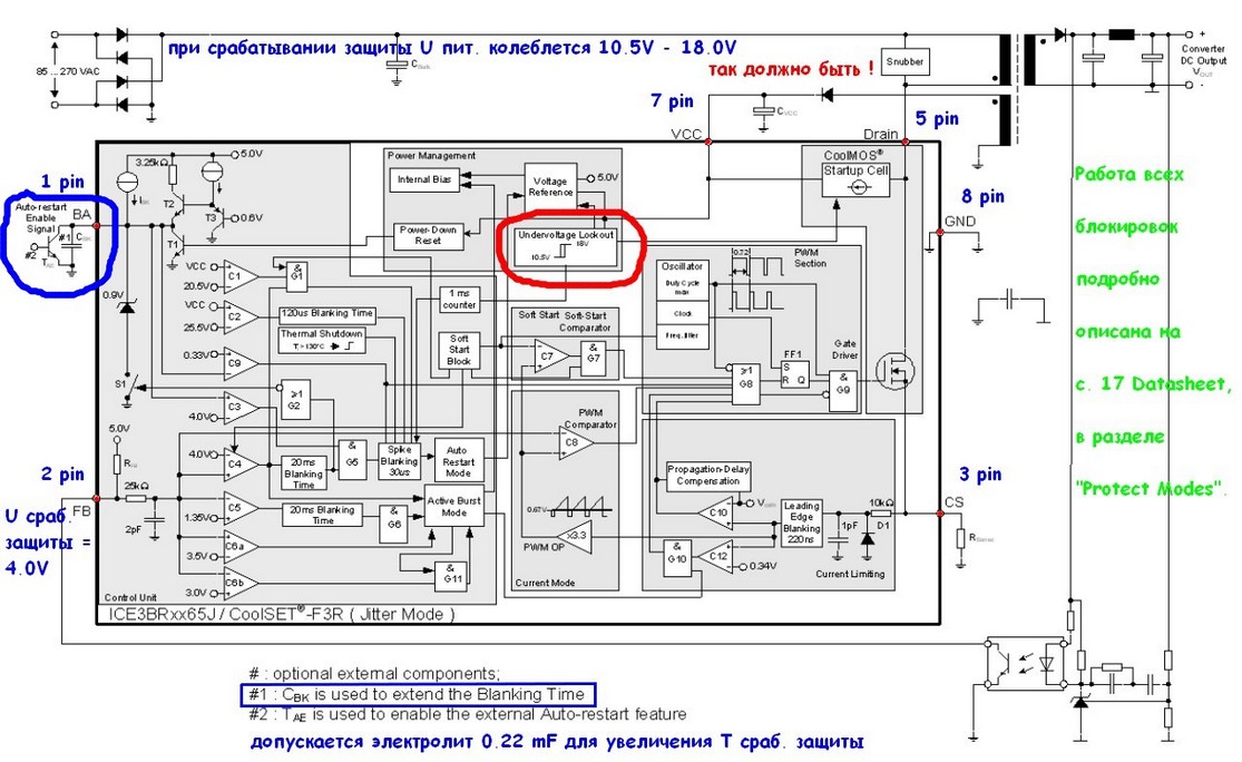 Перепахав обвязку IC501 3BR4765JZ в шахматном порядке и по-диагонали, вдоволь наигравшись с добавочной ёмкостью на вход BA (1pin, extended Blanking & Auto-restart), позволяющей увеличить время срабатывания защиты и чуть не спалив её, нашёл хде собака порылась...