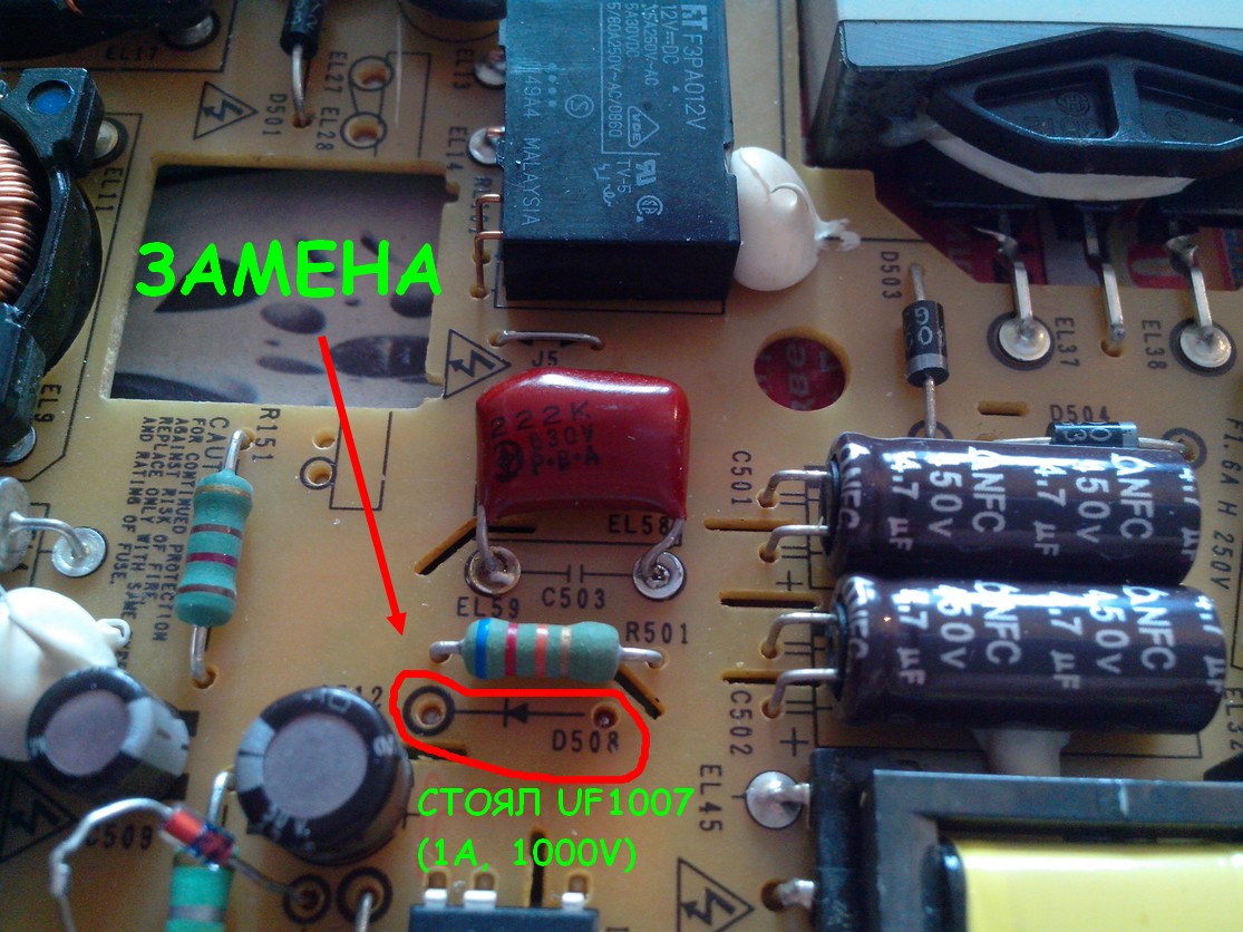 Трабла оказалась в D508 (UF1007 ultrafast 1A, 1000V). Стоит последовательно с C503, параллельно I-й обмотки трансформатора T501 дежурного режима. Сами знаете зачем.