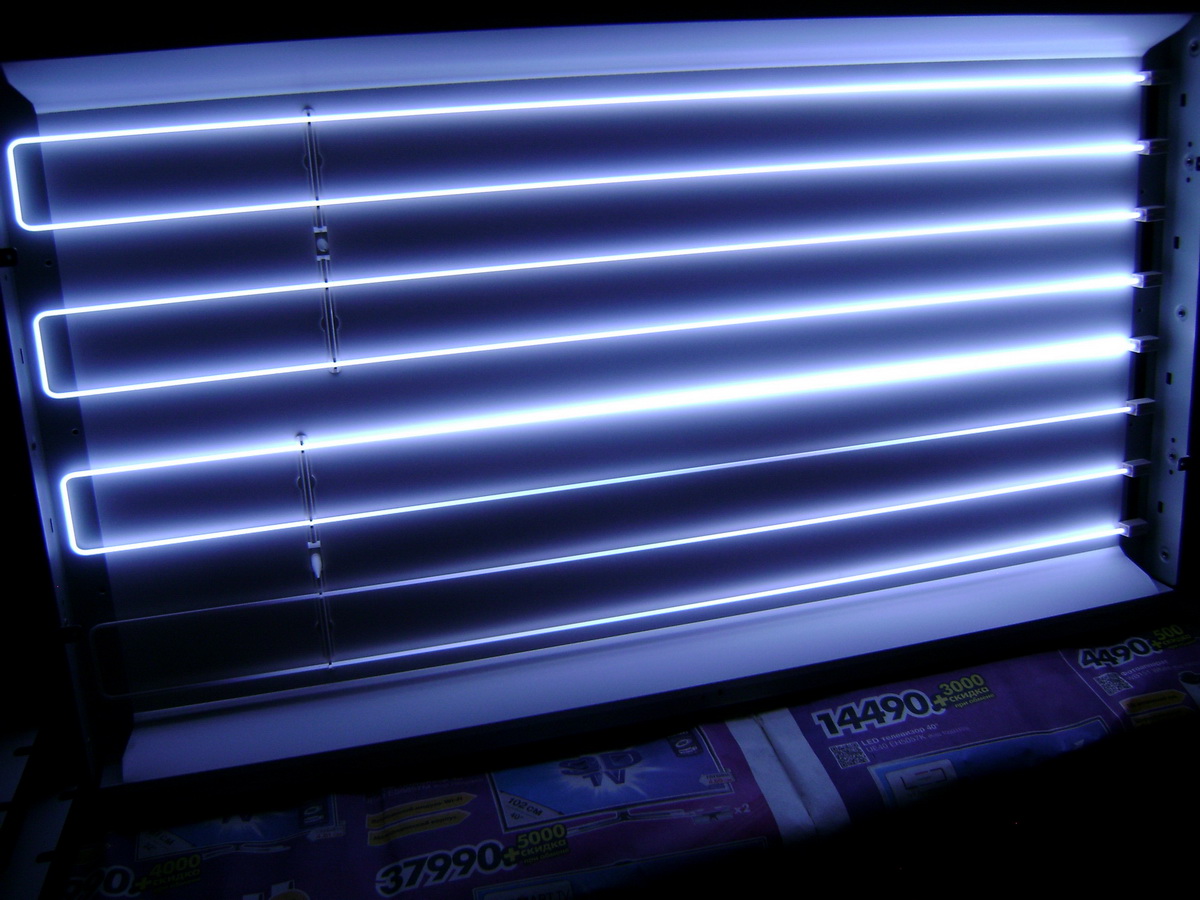 Всем привет! Заказал с Екатеринбурга синенькие кондеры 10pf3kv и на всякий пожарный FAN7313...! и не зря! Заказ приехал и вот результат. Заменил не соответствующие схеме кондеры на 10pf3kv - защита перестала вырубать подсветку! Это уже + ! ! ! В ходе испытаний обнаружил что 4 лампа (на фото сверху в начале темы) стала светить на половину нормально а на половину тусклее! После замены FAN7313 дефект подсветки исчез полностью! С этим разобрались(фото ниже) Идем дальше: во вторичной цепи был обнаружен пробитый транзистор (на схеме V816) - заменил!