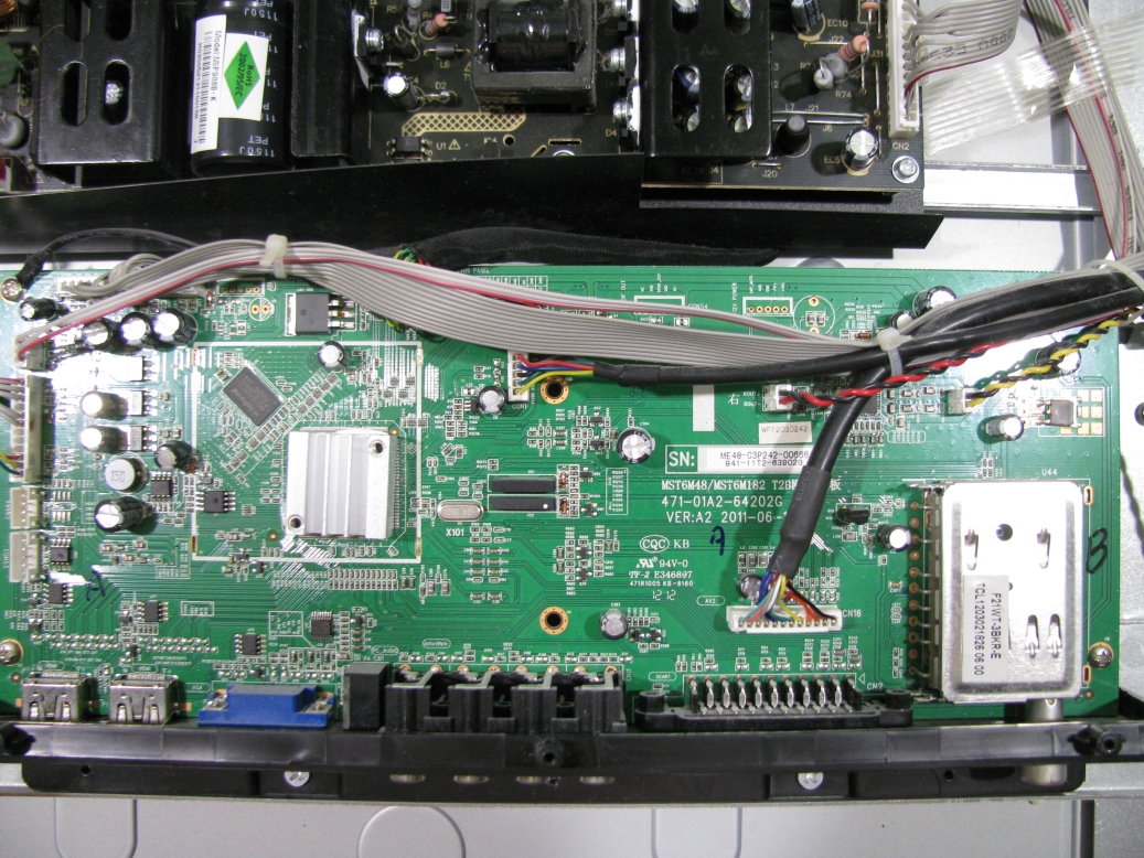 Привезли в ремонт. Кто-то из коллег (или калек) пытался ремонтировать. Прежний владелец "концы" утопил. Новый не в курсе: где,кто,что и т.д. Может у кого-нибудь была в ремонте подобная модель TV? Помогите укомплектовать (тип,фото T-con), так как T-con отсутствует. Питатель работает, подсветка тоже.