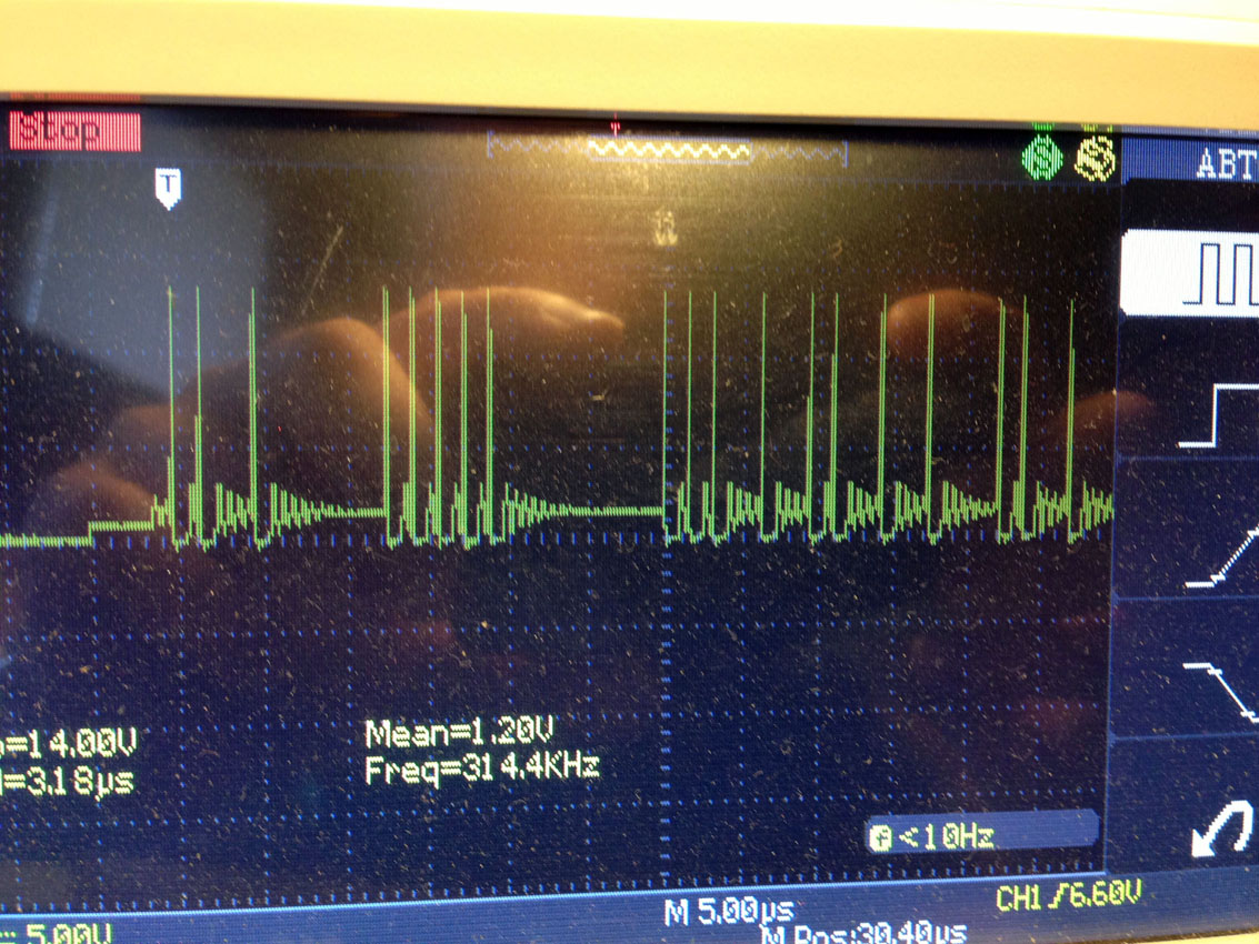 На T-con, на дроселе L102 форма напряжения странная вот фото