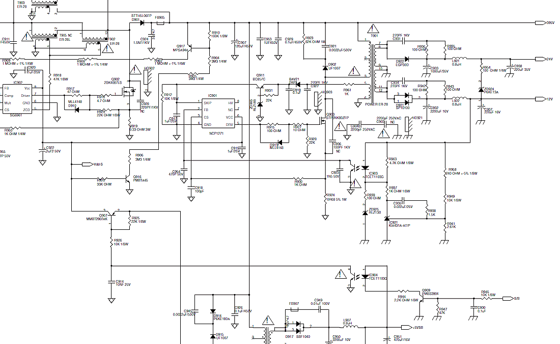 При включении ТВ отсутствуют 12 и 24v. Индикатор светится белым цветом, как и должно быть.Забрал БП с собой. При принудительном включении на сетевом есть 400v. 5v в наличии. Нет 12 и 24v. Блок нагружен по всем выходным источникам. Питание на NCP1271 12v есть.Кстати на плате стоит NCP1219A. Я так понял, это аналог. Погрешил на нее. Заменил на NCP1271. Всю обвязку микросхемы проверил.Заменил IC903. IC923.На полевик с микросхемы сигнала нет. Уже не знаю, куда еще копать. Кто нибудь даст дельный совет? Заранее спасибо.