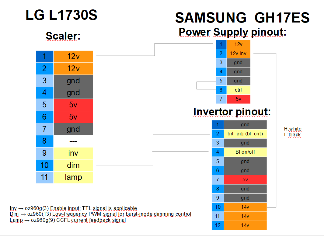 Есть скалер LG 17030 и БП и инвертор от Samsung GH17ES. Их нужно сопрячь. Набросал схему как это должно быть в моем понимании.