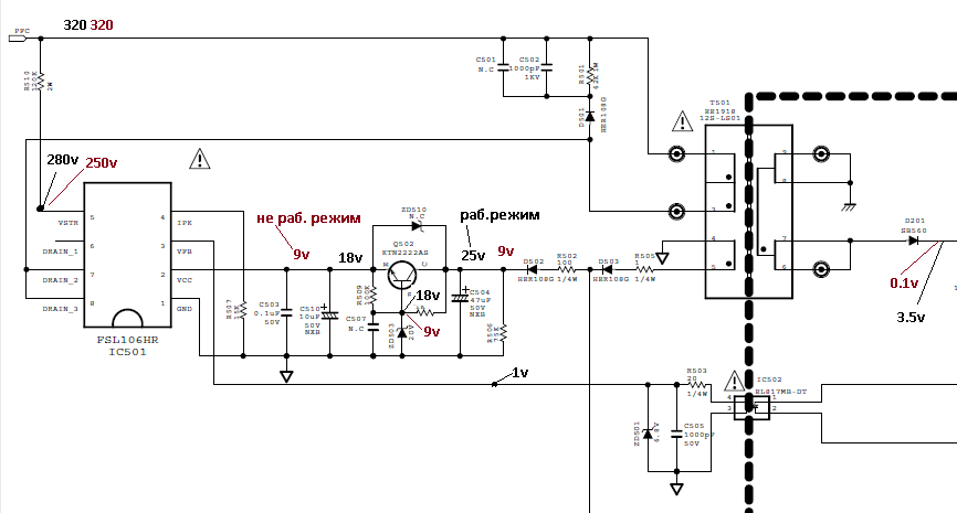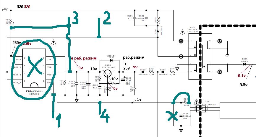 Попросили отремонтировать телевизор LG 42LM340T. При включении в сеть светодиод не горит, при включении с пульта моргает 3 раза и включается, показывает, далее может сам выключится и сразу включится но не всегда. Вскрываю и мерию напряжение дежурки, 3,5v есть, включаю даю поработать, телевизор выключается, мерию дежурку напряжение 0.1v. В процессе замера случайно коротнул питание шим дежурки FSL106HR микруха умерла, заменил аналогом DH321. Включив на столе отдельно от майна и драйвера, 3.5v снова появилось, повесив на нее нагрузку 1.4А дежурка немного работает и снова пропадает, заменил задающие и выходные электролиты, C510, C504, C202, C201, C206 TL431, оптопару, после включения та же картина выключается спустя минут 7-8 почемуто не больше не меньше, плюс уехало напряжение на холостом ходу до 4 вольт, вернул прежний Tl 431 обратно.