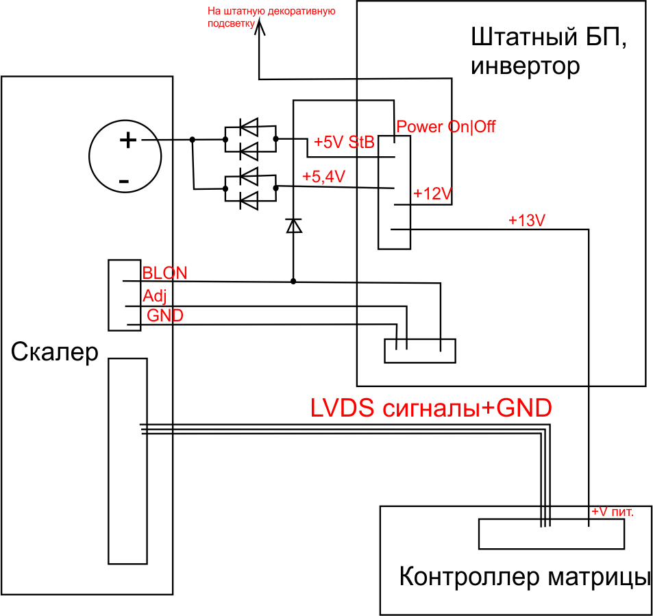 Что получил в итоге (ниже прикладываю схему): канал дежурки в 5V, питает в дежурном режиме скалер, добросовестно ожидающий сигнала с пульта ДУ, чтобы все это запустить. Сигнал с пульта включает скалер, при этом на PoweOn блока питания с BLON скалера поступает 5V и блок питания запускается в полную силу, выдавая 5,4; 12 и 13 вольт. 5,4V сразу же принимает на себя функцию питания самого скалера без дефицита по току; 12V запитывает декоративную штатную подсветку, 13V запитывает контроллер матрицы и... все начинает согласованно работать.