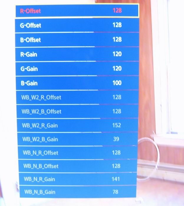 В итоге рабочий ток диодов сохранен на уровне 220мА. Окончательные настройки баланса белого в сервисном меню телевизора представлены на фиг.12. Окончательные настройки изображения представлены на фиг.13, фиг.14, фиг.15.