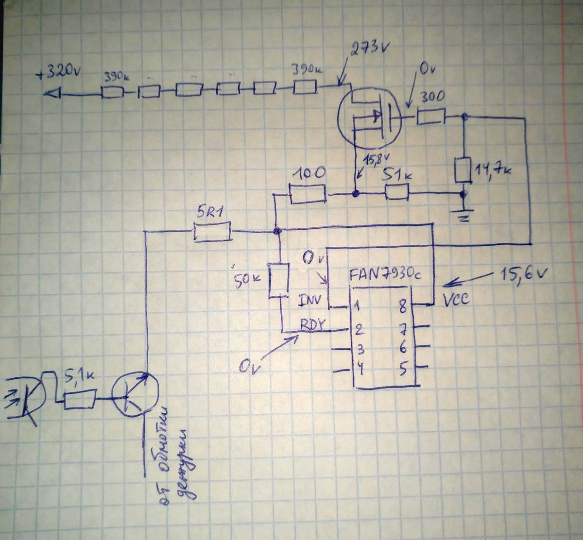 | Цитата: | | На FB появится 5в, если микросхема запустится. | Это понятно, но как оно появится на входе FB микросхемы после ее запуска? Выход питающей обмотки никак не связан со входом оптопары PC501. Изучил под микроскопом всю цепь через оптопару PC501, зарисовал, не вижу как напряжение попадет на вход FB и откуда там сейчас 0.9V?