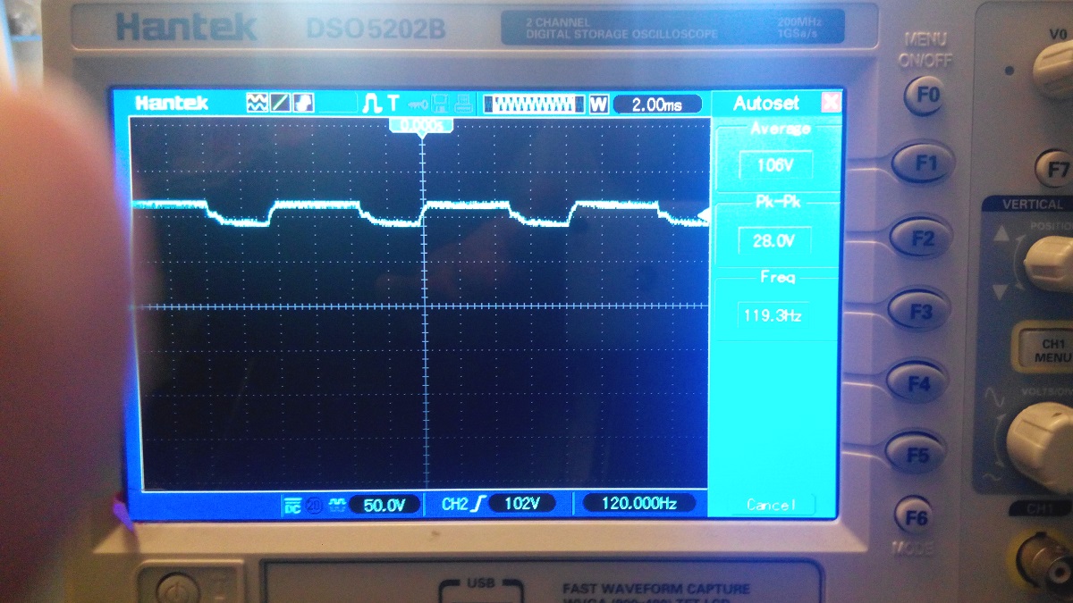 Ещё питание светодиодов посмотрел осциллографом, там меандр с разбросом в 30 вольт. Среднеквадратичное напряжение на мультиметре 106 В. Фото прилагаю. разве это норма?