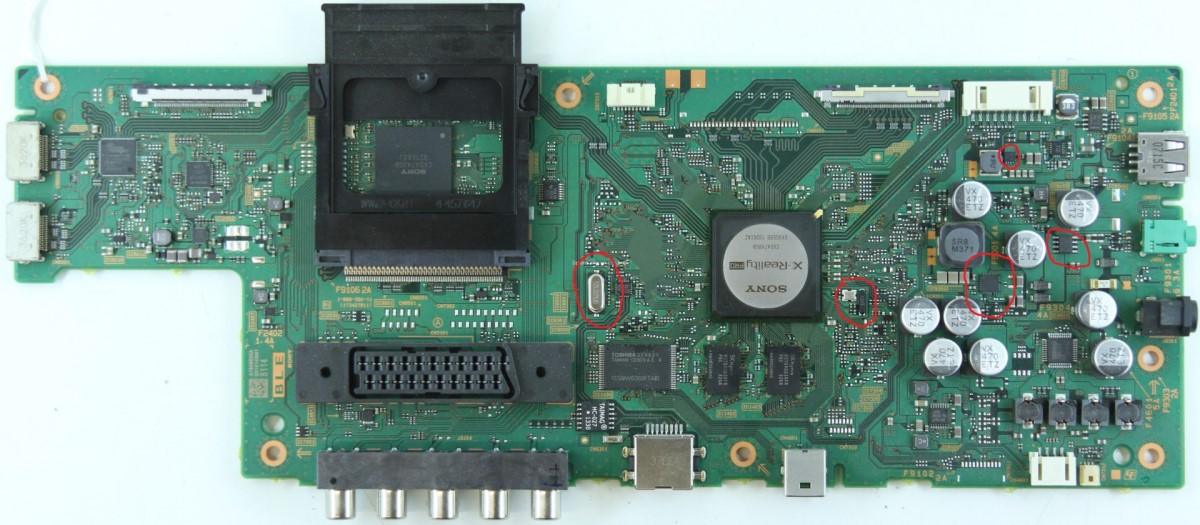 - Справа от проца есть 5 конденсаторов. На трех нижних есть необходимые напряжения, на верхних двух нет. (это мы сравнивали с рабочим аппаратом) Откуда они берутся - неизвестно.