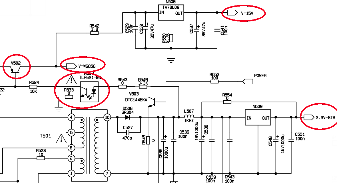 10. Напряжение на 4-ой ноге N507 изменяется... А посмотри, как при этом изменяется напряжение на выходе источника на базе N501. То есть посмотри какое напряжение на С548 - как оно изменяется? Оно как, как я понимаю, должно быть неизменным при любых условиях. Если правильно понимаю, на базе N501 - выполнен дежурный источник. С источником на 3.3V ты разобрался?
