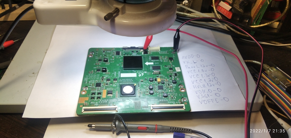 Уважаемые господа форумчане! Помогите разобраться с T-Con. Попал на ремонт с полу черным экраном и заторможенностью! После вскрытия было обнаружено прогар под QD6(P2). Был выпаян и заменен на аналогичный с донорской платы! Изображение восстановилось в виде вертикальных полос заторможенность не пропала, но с обратной стороны что-то очень грелось, я заменил весь участок, после этого я стал устанавливать T-con обратно, при монтаже надавил на плату, и пропало напряжение на всех контрольных точках, на предохранитель приходит 12вольт!!! Картинку дефекта и замеров на тиконе прикрепляю! Правда только те замеры про которые знаю, остальные к.т. мне неизвестны так как тиконами занимался мало((( [jхотел заменить драйвер ISL24826 на аналогичный с донорской платы! Подкинуть другой T-con к сожалению не предоставляется пока возможным! Решил поковырять пока родной.... Если кто то подскажет на что обратить особое внимание или сделать замеры там то там буду признателен... (При вскрытии панели - драйвера на вид вроде в порядке, прогара на матрасе нет),