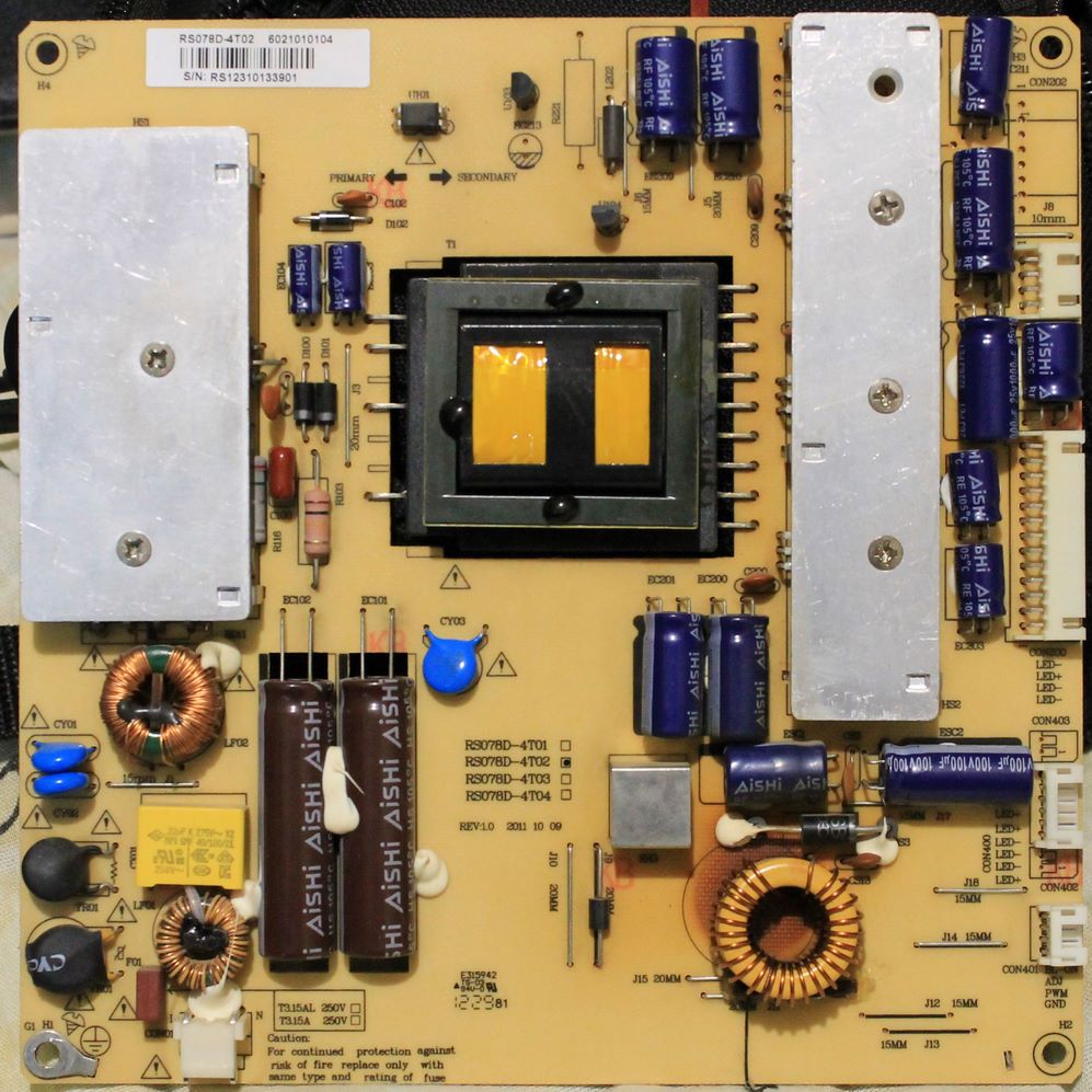 После включения телевизора, через несколько минут пропадает подсветка. Думал накрылись светодиоды, ан нет. Проверяю напряжение на разъёме на подсветку при включении 55 вольт. Через несколько минут подсветка вырубается, и напряжение падает. Подскажите куда копать? Прилагаю фото платы. Шасси видимо RS078D-4T02